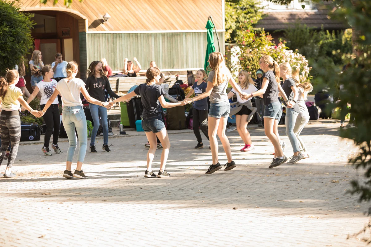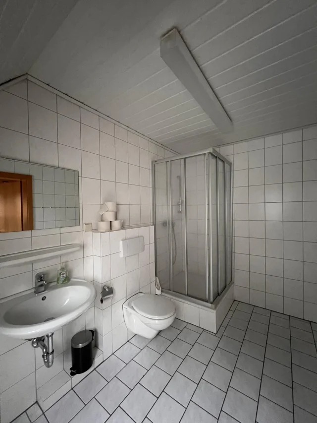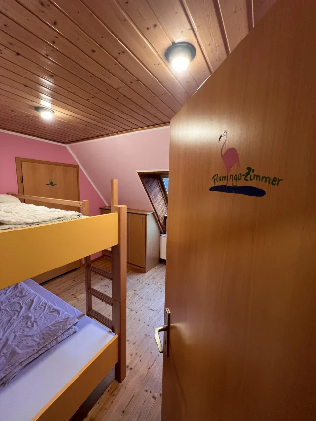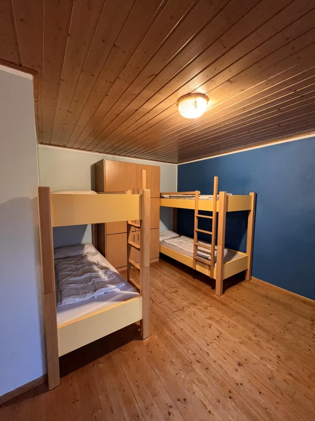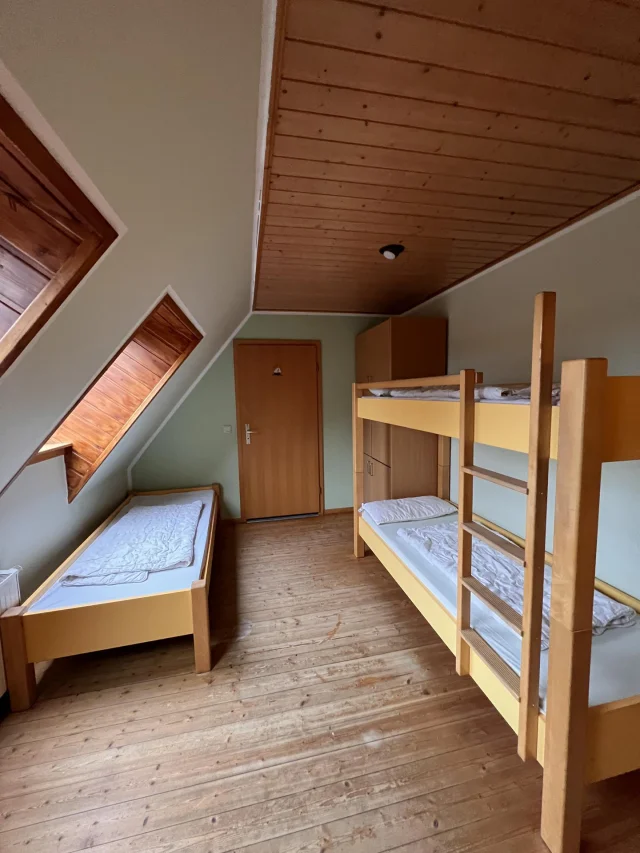Wir bieten insgesamt Platz für 55 Leute, genauer für 47 Feriengäste und 8 Betreuer. Die meisten Zimmer haben zwischen drei und sechs Betten. Genauer gesagt haben wir drei 3-Bettzimmer, ein 4-Bettzimmer, zwei 5-Bettzimmer, vier 6-Bettzimmer und ein Zimmer mit acht Betten. Jedes Zimmer hat eine eigene Dusche und eigenes WC, mit eigenem, direktem Zugang vom Zimmer aus. Einzige Ausnahme: zwei der 3-Bettzimmer. Sie haben ein eigenes Bad, aber es liegt zwei Schritte neben der Zimmertür. Stauraum für Koffer & Co. ist vorhanden.
