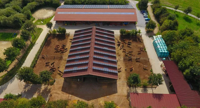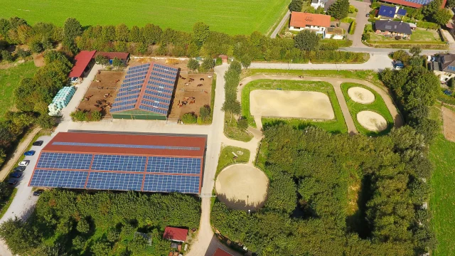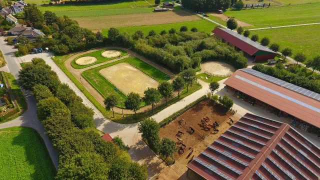 Wenn man an diesem Brunnen steht, sieht man: unser Gästehaus, das Büro mit dem kleinen Hofladen, einen Putzplatz, der zu einem Stall umfunktioniert werden kann, die Sattelkammer, eine Scheune, einen überdachten Anbindeplatz, Schaukel und Wippe, den Großpferdestall und – etwas versteckt hinter den Gebäuden - eine unserer Reithallen. In der Scheune gegenüber von unserem Gästehaus sind weitere Anbindplätze, ein Solarium für Pferde, unsere Haferstation und alles, was man sonst noch braucht, um Pferde zu verwöhnen.