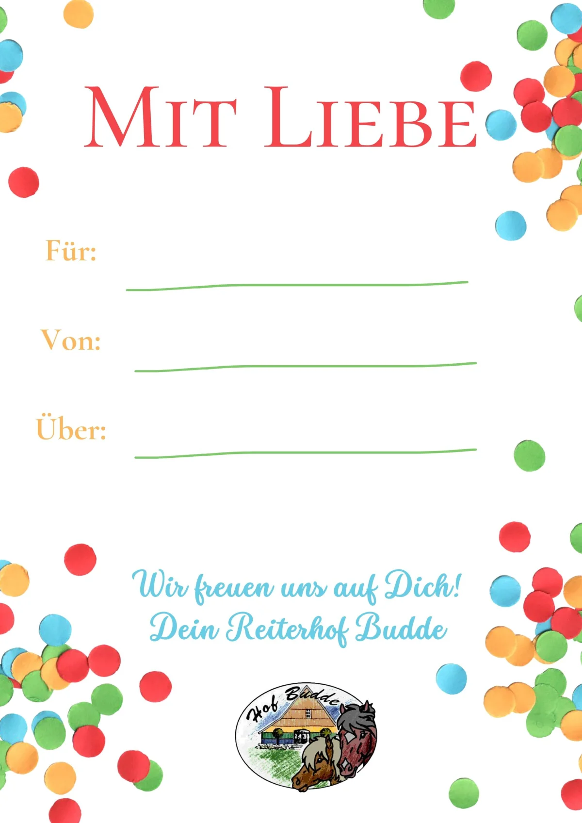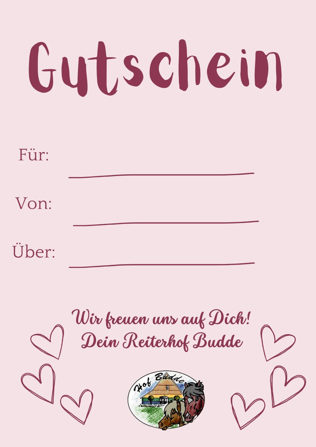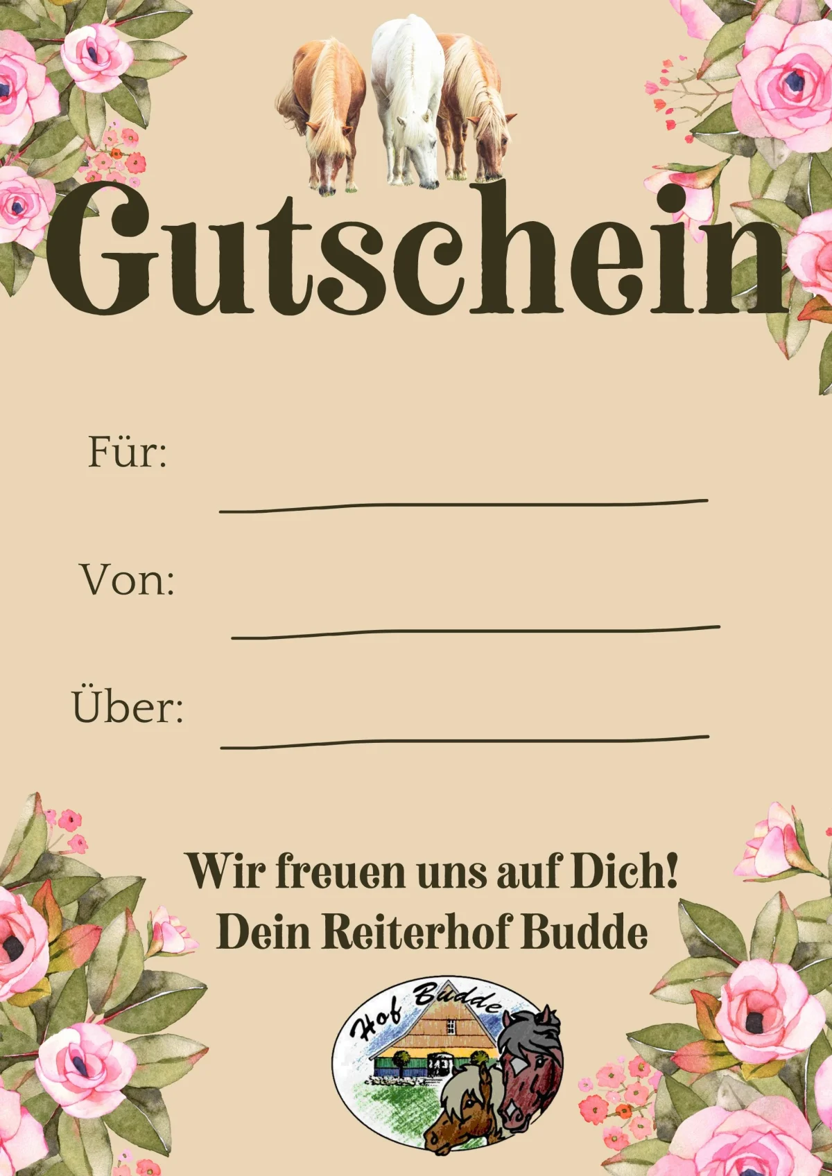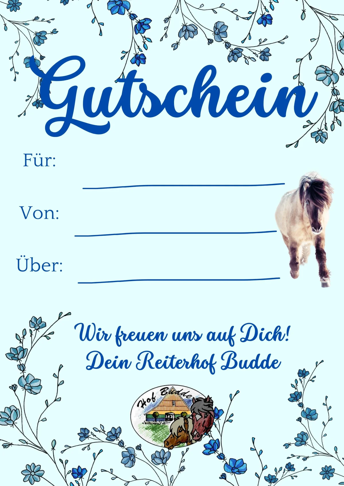 Verschenke unvergessliche Reiterferien! Lade hier deinen Gutschein herunter, fülle ihn aus und bereite deinen Liebsten eine Freude.