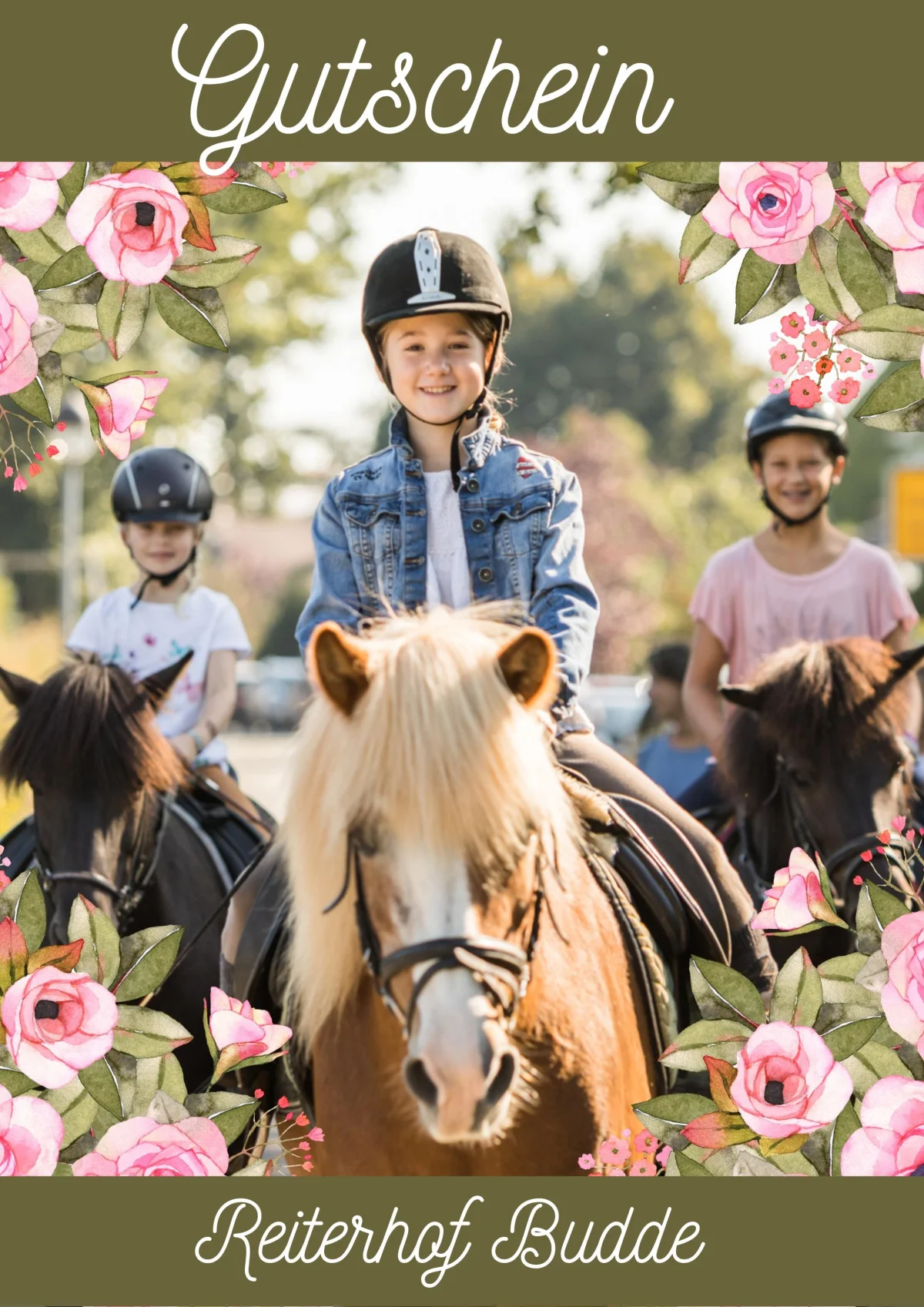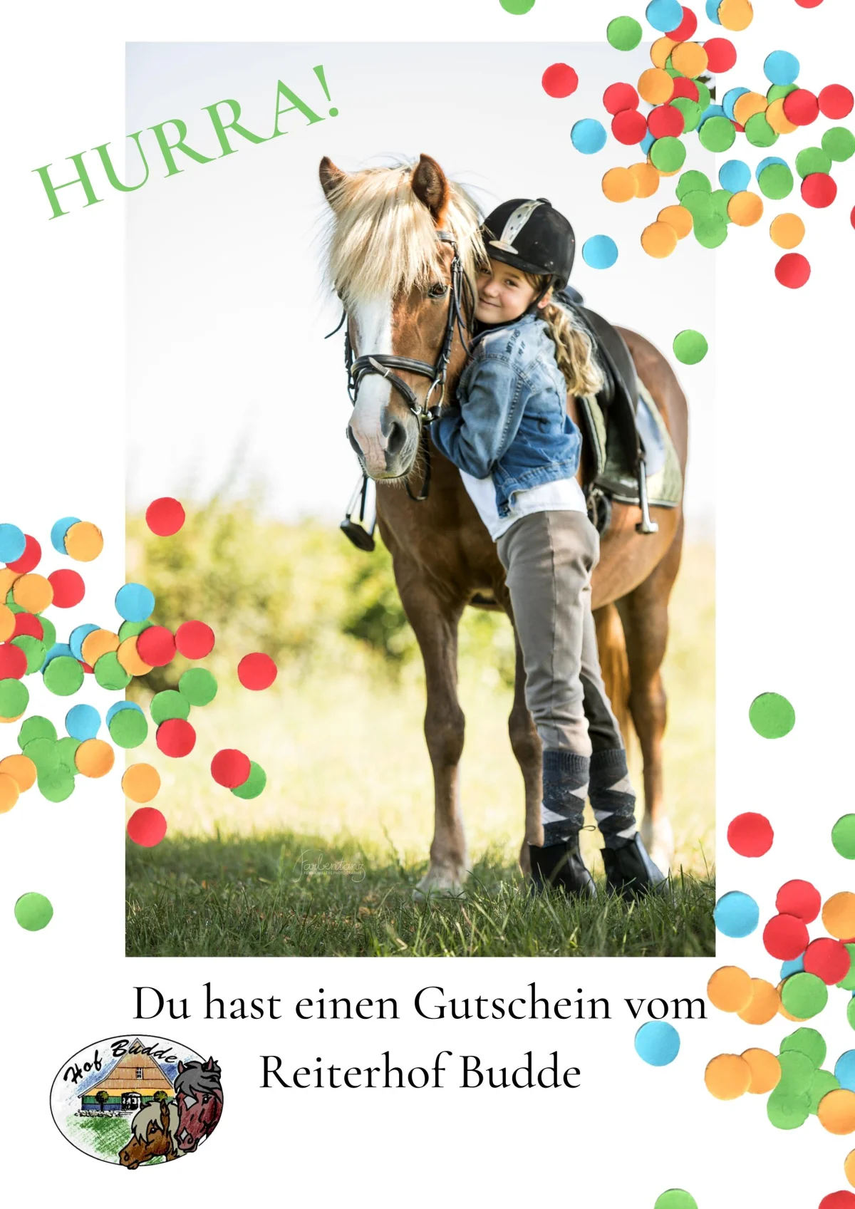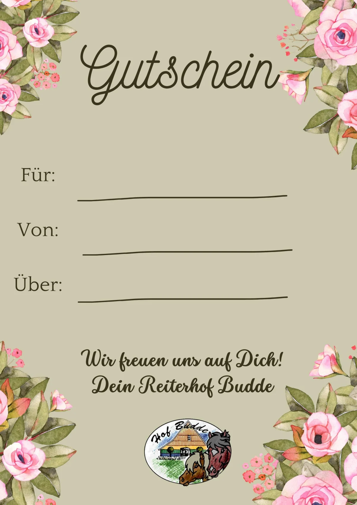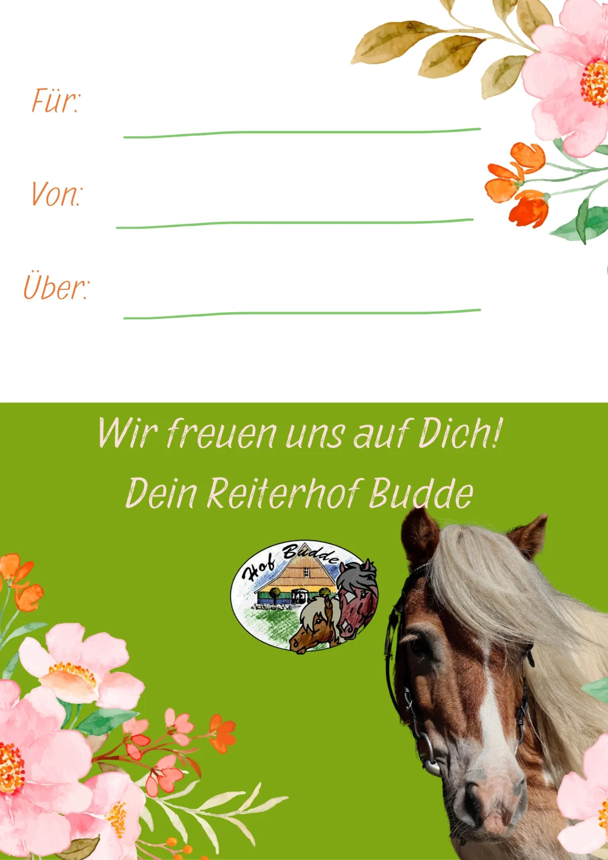 Verschenke unvergessliche Reiterferien! Lade hier deinen Gutschein herunter, fülle ihn aus und bereite deinen Liebsten eine Freude.